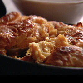 - Take the pan off the heat and add the cream – ignoring all spluttering – followed by the bourbon and milk. Whisk to mix, then still whisking add the beaten eggs. Pour this quickly over the croissants and leave to steep for 10 minutes.